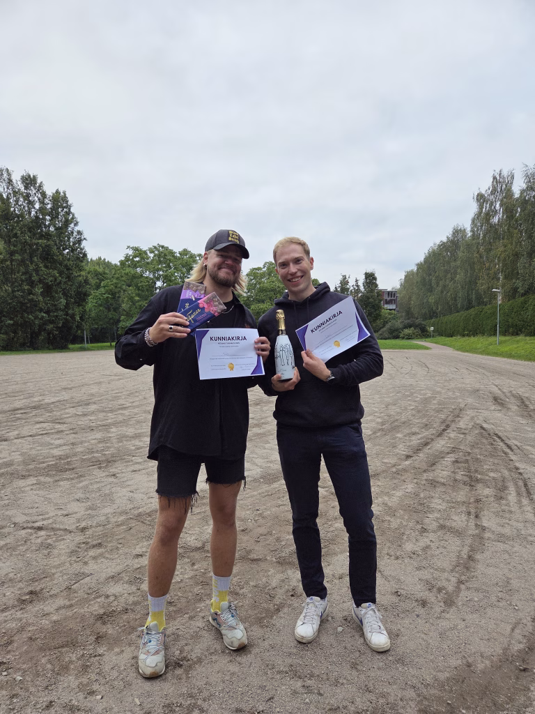 Napataan PitkätPojat eli Mikko Korhonen ja Lauri Parkkila valokuvattaviksi. ”Meillä oli Laurin kanssa pelikirjaan ennalta sovittu yllättävä ja aggressiivinen heittotaktiikka, eikä mittanauhan käyttöä arasteltu – lähes joka tilanne tarkistettiin. Sillä tavalla päästiin selkeästi vastustajajoukkueiden ihon alle kerta toisensa jälkeen, ja lopputulos puhuu puolestaan! Kiitokset taitaville vastustajille ja turnauksen järjestäjille”, Mikko kertoo kujeillen. “Fiilis oli tosiaan hyvä, mutta kilpailuhenkinen”, Lauri vielä summaa.