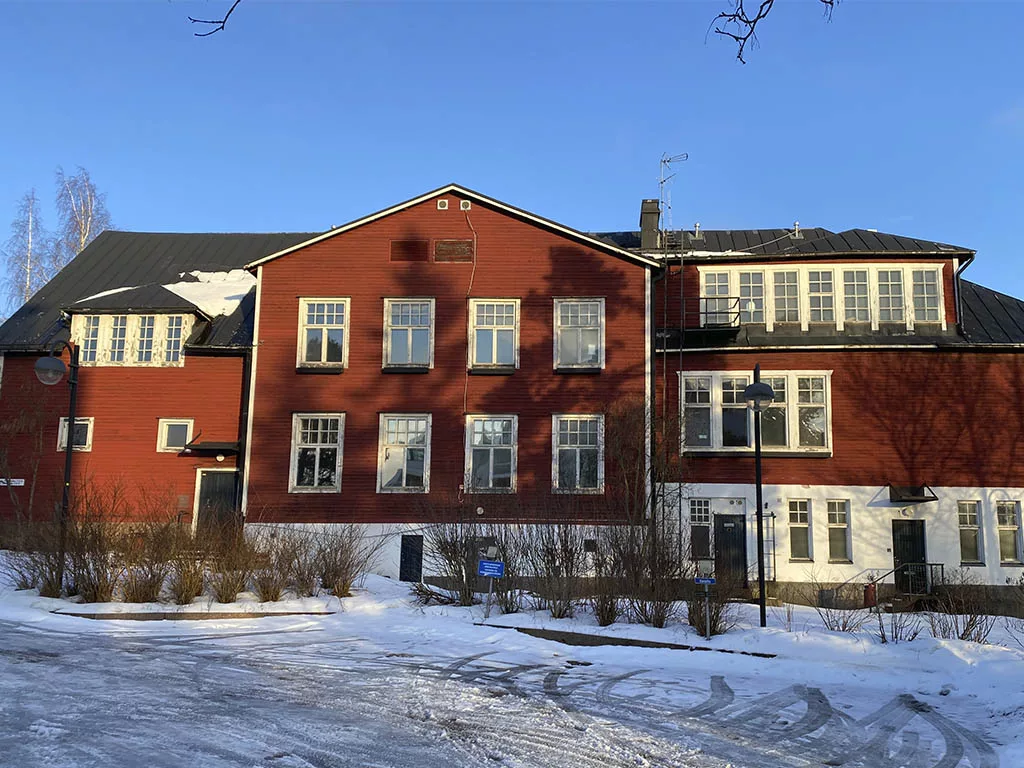 Lähdemme rakennesuunnittelijoiden matkaan mukaan: ekskursiomme kohde on Kauniaisten keskustan tuntumassa oleva yli satavuotias hirsirakennus, joka sijaitsee näkyvällä paikalla mäenrinteessä. Rakennuksessa toimi reilun 60 vuoden ajan Grankulla samskola, joka oli Kauniaisten ensimmäinen koulu. Rakennus valmistui vuonna 1909. Pystyäkseen vastaamaan alati kasvavaan oppilasmäärään, koulurakennusta jouduttiin laajentamaan useamman kerran, mutta laajennuksista huolimatta koulun toimintaa oli jaettava myös muihin ympärillä oleviin rakennuksiin.